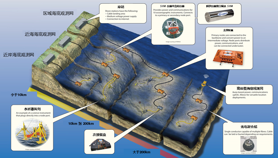 海底觀測(cè)網(wǎng)由岸站、主節(jié)點(diǎn)、次節(jié)點(diǎn)、SIIM(海底儀器接口模塊)、科學(xué)儀器設(shè)備和光電纜等組成,利用海底觀測(cè)網(wǎng)對(duì)特定水域進(jìn)行長(zhǎng)時(shí)間、不間斷的多參數(shù)、大范圍監(jiān)測(cè),為軍事應(yīng)用、海洋科學(xué)研究、海上石油天然氣開(kāi)發(fā),以及其它海洋應(yīng)用提供科學(xué)數(shù)據(jù)支撐。